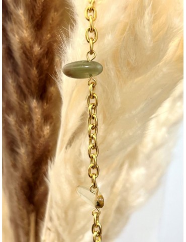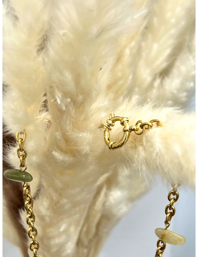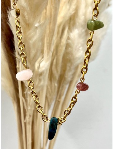 .- Gargantilla de eslabones de acero con baño dorado, cierre redondo  de acero y piedras semipreciosas irregulares