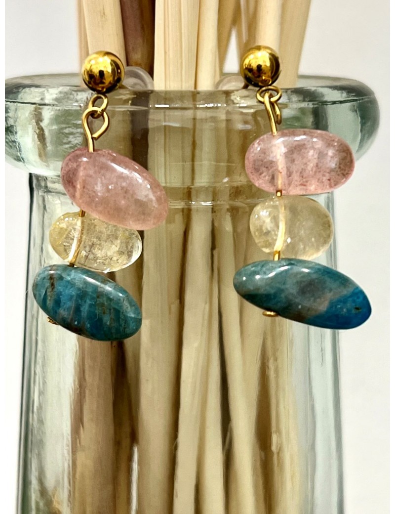 .- pendientes con base de acero dorado en forma de bola y  piedras semipreciosas e irregulares en tonos rosa, citrino y azul (Modelo 1) y en tonos citrino, rosa y verde (Modelo 2)