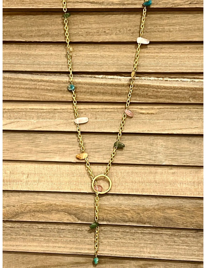 Collar largo de cadena de eslabones en acero con baño dorado, círculo dorado y piedras semipreciosas e irregulares. Cada piedra es única tanto en forma como tamaño y color. La cadena se desliza por el círculo para ajustarlo a tu gusto y llevarlo a la altura que prefieras. Cada pieza es única y elegante